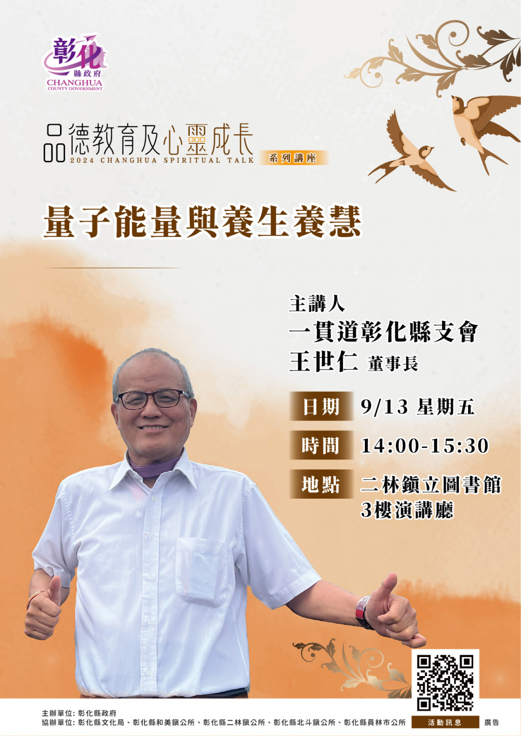 跑馬燈建議文字為:「彰化縣2024年品德教育及心靈成長系列講座9月13日14時,於二林鎮立圖書館3樓演講廳,邀請一貫道彰化縣支會王世仁董事長主講『量子能量與養生養慧』,歡迎踴躍參加。」 |