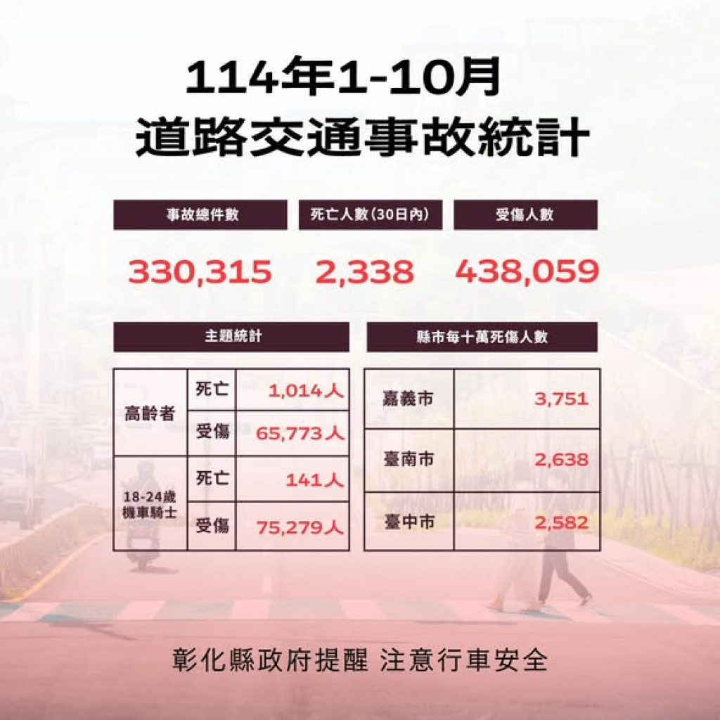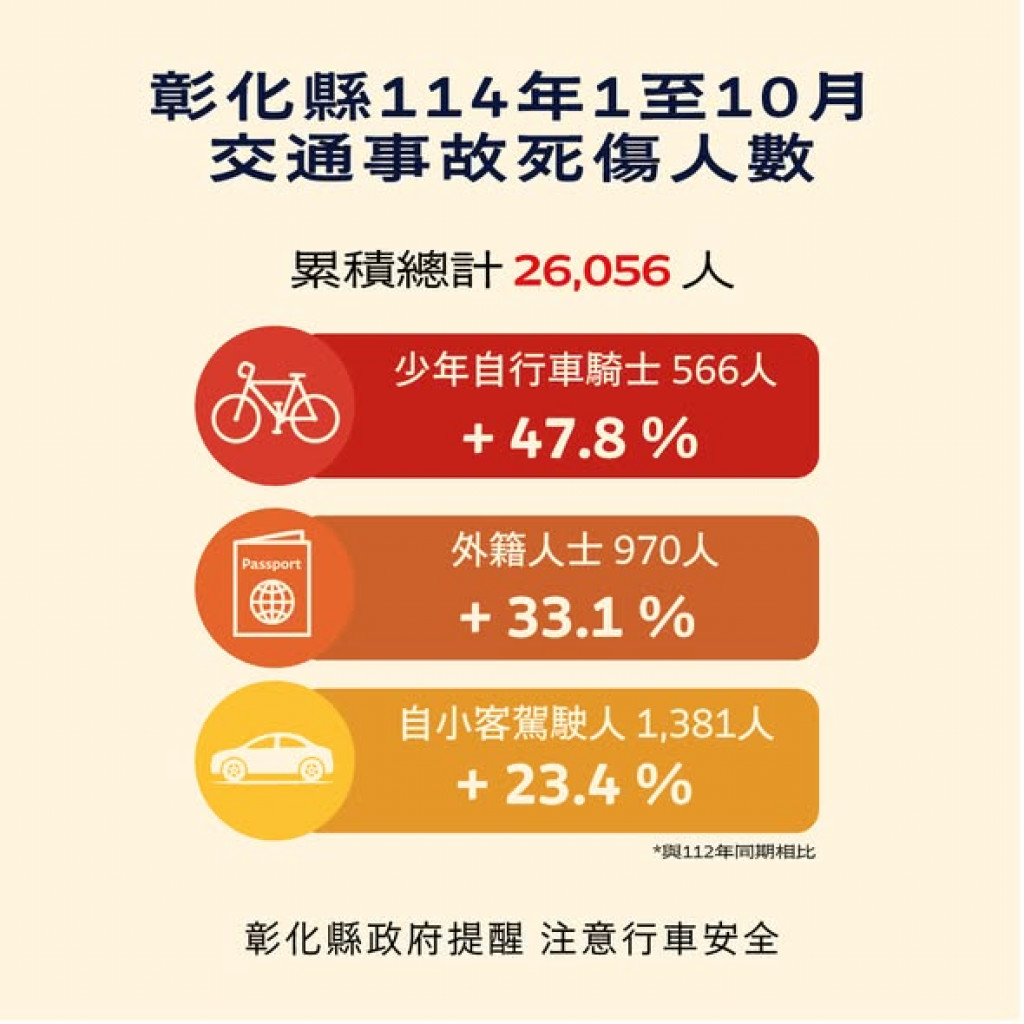 | 四、 | 附件為「114年1-10月全國道路交通事故統計、彰化縣交通事故死傷人數增加排行、本縣各鄉鎮市30日死亡人數、肇事熱點及交通事故肇因統計」共5份統計資料宣導圖,社群宣導內容可參閱或分享本處「花現彰化-彰化縣政府新聞處」(https://pse.is/8mb444)臉書粉絲專頁,相關宣導圖片素材請參閱:https://reurl.cc/DbyGR5。 |